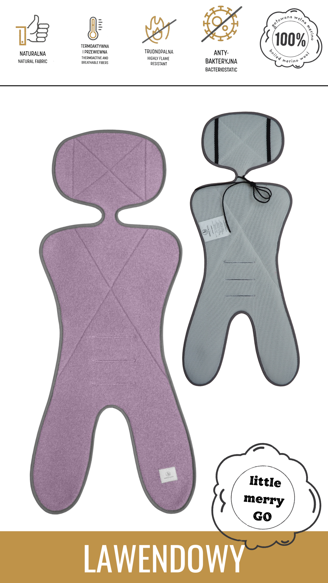Wkładka do fotelików samochodowych. Z wierzchu: gotowana wełna merino najwyższej jakości ze znakiem WOOLMARK oraz Certyfikatami RWS i Oeko-Tex. Od spodu siatka dystansowa polskiej produkcji grubości 5 mm również z certyfikatem Oeko-Tex. Siatka ma wyjątkową strukturę plastra miodu, amortyzuje oraz zapewnia obieg powietrza. Wszystkie użyte dodatki (lamówka, metki, nitki oraz gumki) są trudnopalne oraz polskiej produkcji. Użycie trudnopalnych materiałów ochroni przez szybkim rozprzestrzenianiem się ognia w przypadku zaprószenia. To najbezpieczniejszy produkt na rynku.