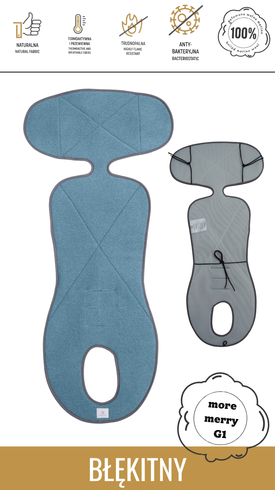 Wkładka do fotelików samochodowych. Z wierzchu: gotowana wełna merino najwyższej jakości ze znakiem WOOLMARK oraz Certyfikatami RWS i Oeko-Tex. Od spodu siatka dystansowa polskiej produkcji grubości 5 mm również z certyfikatem Oeko-Tex. Siatka ma wyjątkową strukturę plastra miodu, amortyzuje oraz zapewnia obieg powietrza. Wszystkie użyte dodatki (lamówka, metki, nitki oraz gumki) są trudnopalne oraz polskiej produkcji. Użycie trudnopalnych materiałów ochroni przez szybkim rozprzestrzenianiem się ognia w przypadku zaprószenia. To najbezpieczniejszy produkt na rynku.