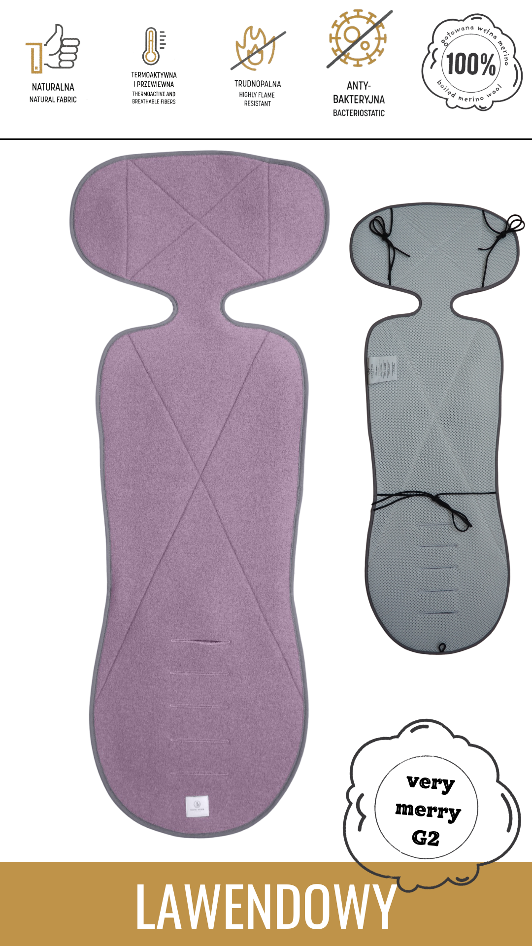 Wkładka w rozmiarze VERY MERRY (G2) od zawsze wyróżniała się na rynku swoją wielkością - to aż 107 cm wełny merino! Przeznaczona jest do fotelików do 150 cm wzrostu. W tym roku udoskonaliliśmy jej budowę tak, by jeden wariant dopasowywał się do fotelików z i bez prowadnicy pasa biodrowego.